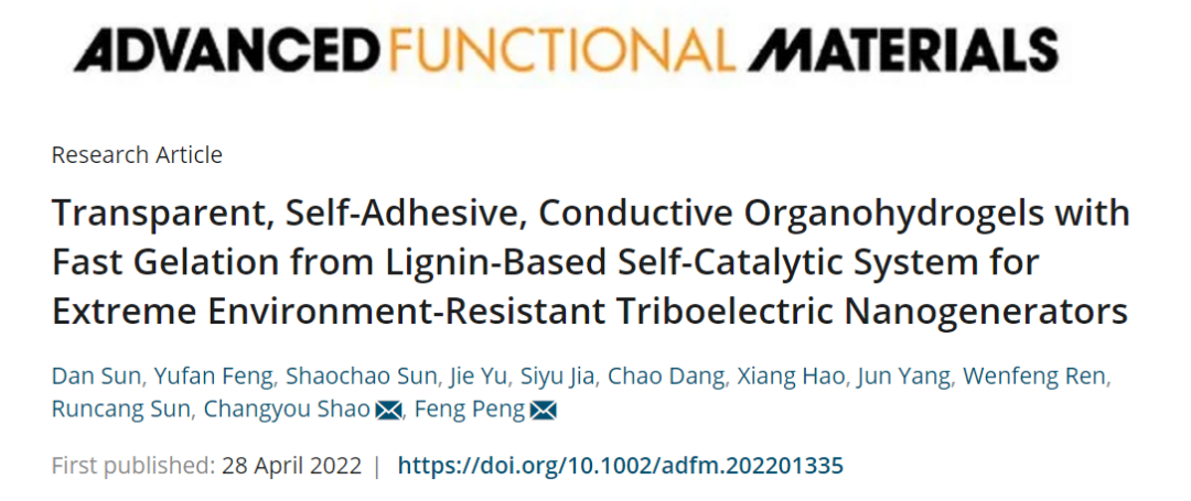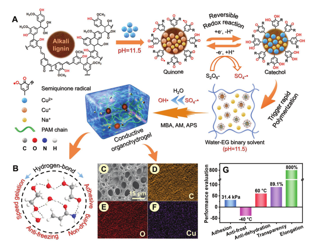 有鉴于此,437ccm必赢国际邵长优博士和北京林业大学彭锋教授团队本文设计了一种基于碱木质素(AL)大分子的简便通用的自催化体系(AL-Cu2+),用于在碱性水-乙二醇(EG)二元溶剂中快速制备导电透明的有机水凝胶,获得的有机水凝胶具有极端的环境适用性(-40~60℃)、合格的拉伸性(≈800%伸长率)和坚固的自粘性(≈31.4 kPa)。这项工作为基于多功能软质材料和快速凝胶化策略设计环保柔性TENG提供了启示,引起了人们对木质素可持续高价值利用的更多关注。相关工作以“Transparent, Self-Adhesive, Conductive Organohydrogels with Fast Gelation from Lignin-Based Self-Catalytic System for Extreme Environment-Resistant Triboelectric Nanogenerators”为题发表在著名期刊Advanced Functional Materals上。