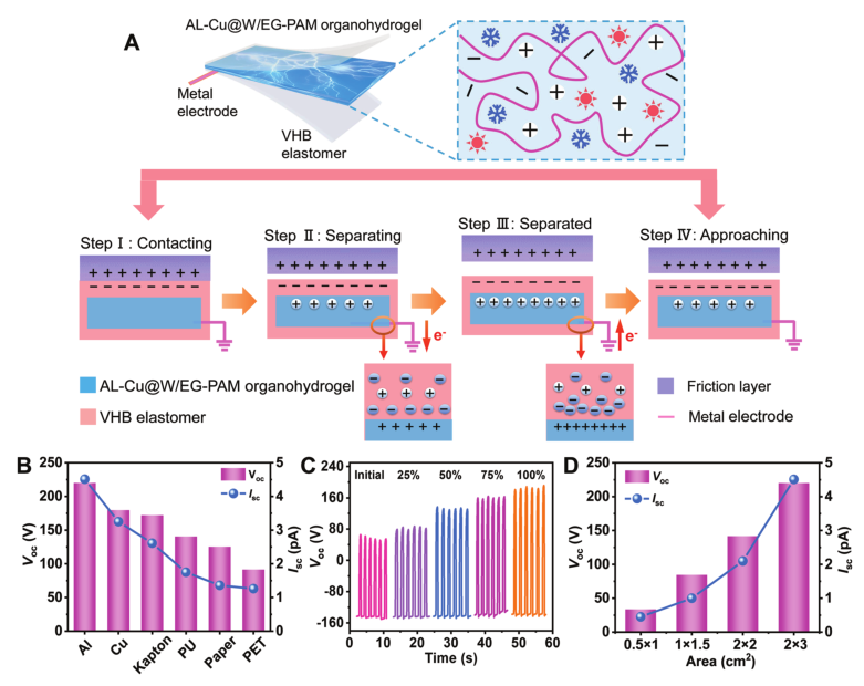 作者采用水与EG比例为2:3的有机水凝胶(W2EG3)制备用于能量收集的单电极O-TENG。选择了铝箔纸、铜膜、卡普顿膜、聚氨酯膜、纸和聚对苯二甲酸乙二醇酯(PET)膜等几种常用材料,以确定O-TENG的电气化能力和获得的开路电压(Voc)和短路电流(Isc)。结果显示,六种材料的Voc和Isc都遵循以下顺序:Al>Cu>Kapton>PU>paper>PET。Al材料的稳定Voc和Isc分别达到约220 V和4.5 pA。就柔韧性而言,随着应变水平从0%增加到100%,由拉伸引起的摩擦电气化层更薄的VHB层和更大的表面积共同促进电输出的提高。